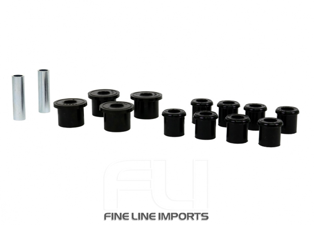 All in one leaf spring bushing service kit covering front and rear eyes of the leaf plus shackle bushings. High kilometres and heavy load carrying causes excessive wear on rubber bushings. Whiteline's signature black bushings are made tough and offer outstanding abrasion resistance, high load bearing capability (4WD's, utes and towing), flexibility, increased tensile strength and chemical resistance to oil, grease, ozone and weathering.