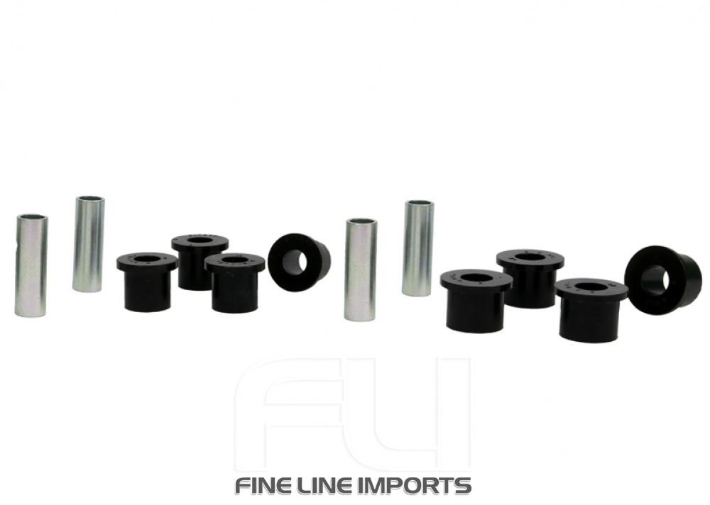 All in one leaf spring bushing service kit covering front and rear eyes of the leaf plus shackle bushings. High kilometres and heavy load carrying causes excessive wear on rubber bushings. Whiteline's signature black bushings are made tough and offer outstanding abrasion resistance, high load bearing capability (4WD's, utes and towing), flexibility, increased tensile strength and chemical resistance to oil, grease, ozone and weathering.