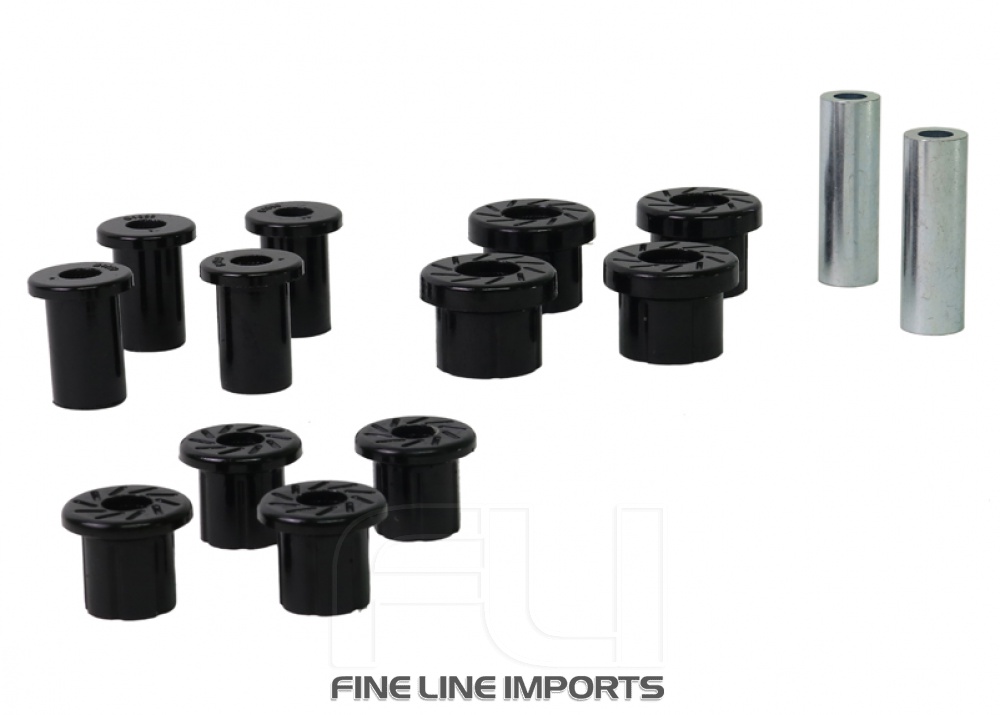 All in one leaf spring bushing service kit covering front and rear eyes of the leaf plus shackle bushings. High kilometres and heavy load carrying causes excessive wear on rubber bushings. Whiteline's signature black bushings are made tough and offer outstanding abrasion resistance, high load bearing capability (4WD's, utes and towing), flexibility, increased tensile strength and chemical resistance to oil, grease, ozone and weathering.