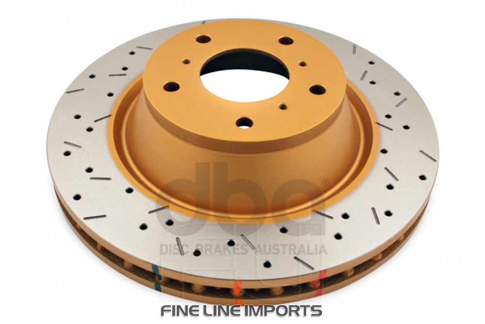 Premium non-directional cross-drilled and slotted design of DBA brake rotors increases the number of outgassing exit points allowing more brake pad friction gasses to escape through.